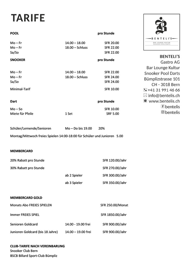 Preise: bitte informiert euch im Benteli's