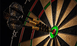 4 Steeldartscheiben mit Topmaterial sind vorhanden, umgeben von Bartischen und Stühlen, befinden sich in der Mitte des Lokales.